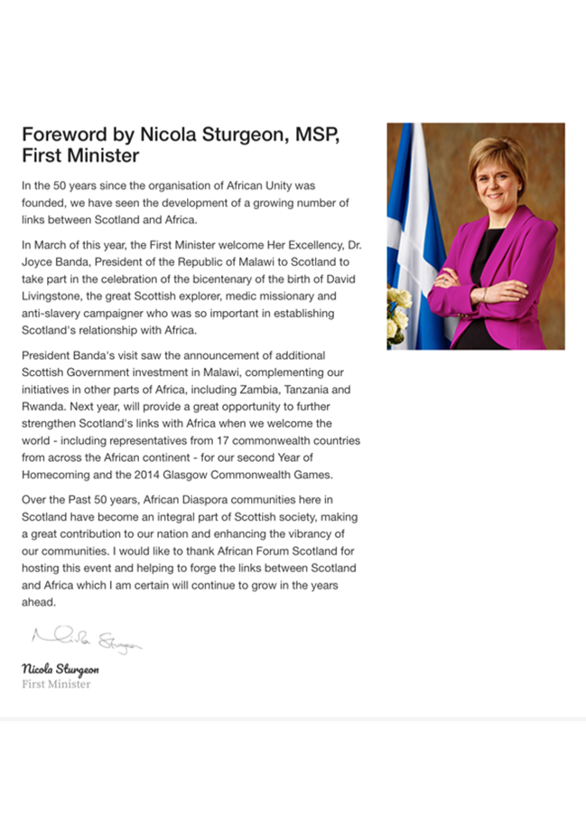 Since 2007, African Forum Scotland has steadily grown in performance, receiving recognition and endorsement from United Nations Conference for Trade and Development – UNCTAD. Our successes have been further acknowledged and endorsed by the First Minister of Scotland ‘Nicola Sturgeon’ to mark our achievement in generating international trade from Scotland to Africa and vice versa.